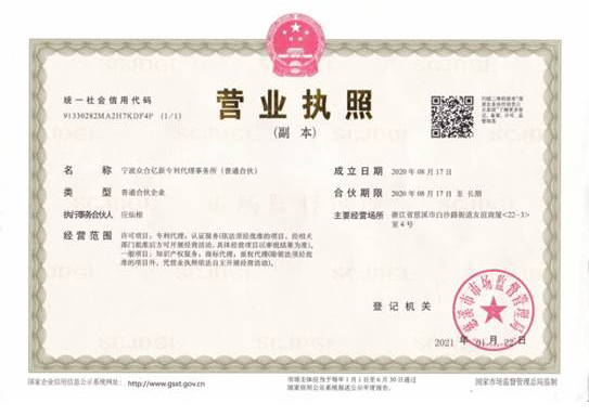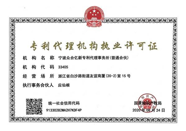 浙江亿新知识产权服务有限公司前身为慈溪众合知识产权代理事务所,创始于2004年,为了服务更多的创新企业,实现“服务亿万创新企业”的理念,后更名为浙江亿新知识产权,旗下公司包括:宁波众合亿新专利代理事务所(机构代码33405)、中范(北京)认证有限公司。其中宁波众合亿新专利代理事务所是慈溪市科技服务联盟理事单位,前湾区知识产权工作站。公司位于浙江省慈溪市文化商务区友谊商厦,并在北京、青岛设有办事处。